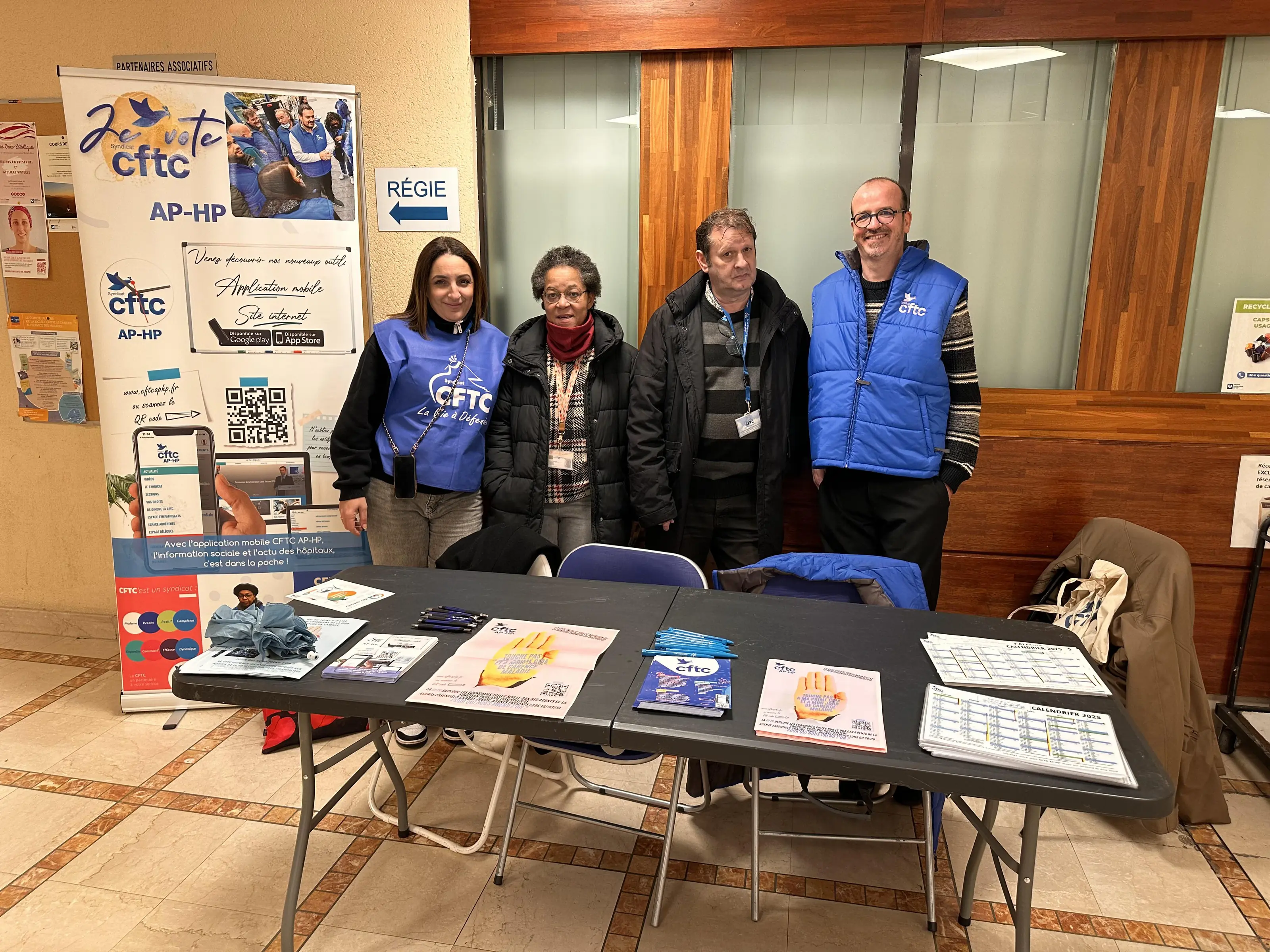 Journée rencontre du personnel à la sortie du self et passage dans les étages voir les collègues avec calendriers et flyers de notre application .